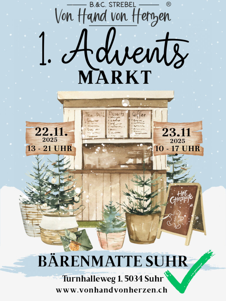 Am Samstag, 22. November und Sonntag, 23. November 2025 verwandelt sich die die Bärenmattenhalle in Suhr in ein liebevoll geschmücktes Winterwunderland. Zahlreiche Ausstellerinnen und Aussteller sorgen mit handgefertigten Produkten, kreativen Geschenkideen und einzigartigem Kunsthandwerk für eine ganz besondere Atmosphäre – ideal, um frühzeitig in Weihnachtsstimmung zu kommen und besondere Geschenke zu entdecken.
